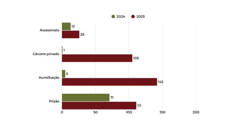 A respeito das ocorrências de violências, também houve diminuição: em 2024, foram notificados 1.548 casos e, no ano passado, 978, o que representa um recuo de, aproximadamente, 37%. Contudo, o relatório denuncia o aumento nos registros de prisões (de 71 para 111), casos de humilhação (de 5 para 142) e cárcere privado (de 1 para 105) nesse mesmo período.