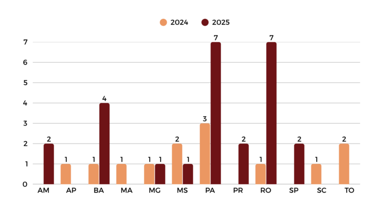 A Região Norte do país concentra pouco mais de 61% dos casos de assassinatos registrados em 2025 (16) e, no ano retrasado, foi palco de outros 7 registros. Em recorte por estado, Rondônia e Pará acumulam, cada um, 7 casos; ao passo que o Amazonas apresentou 2 ocorrências.