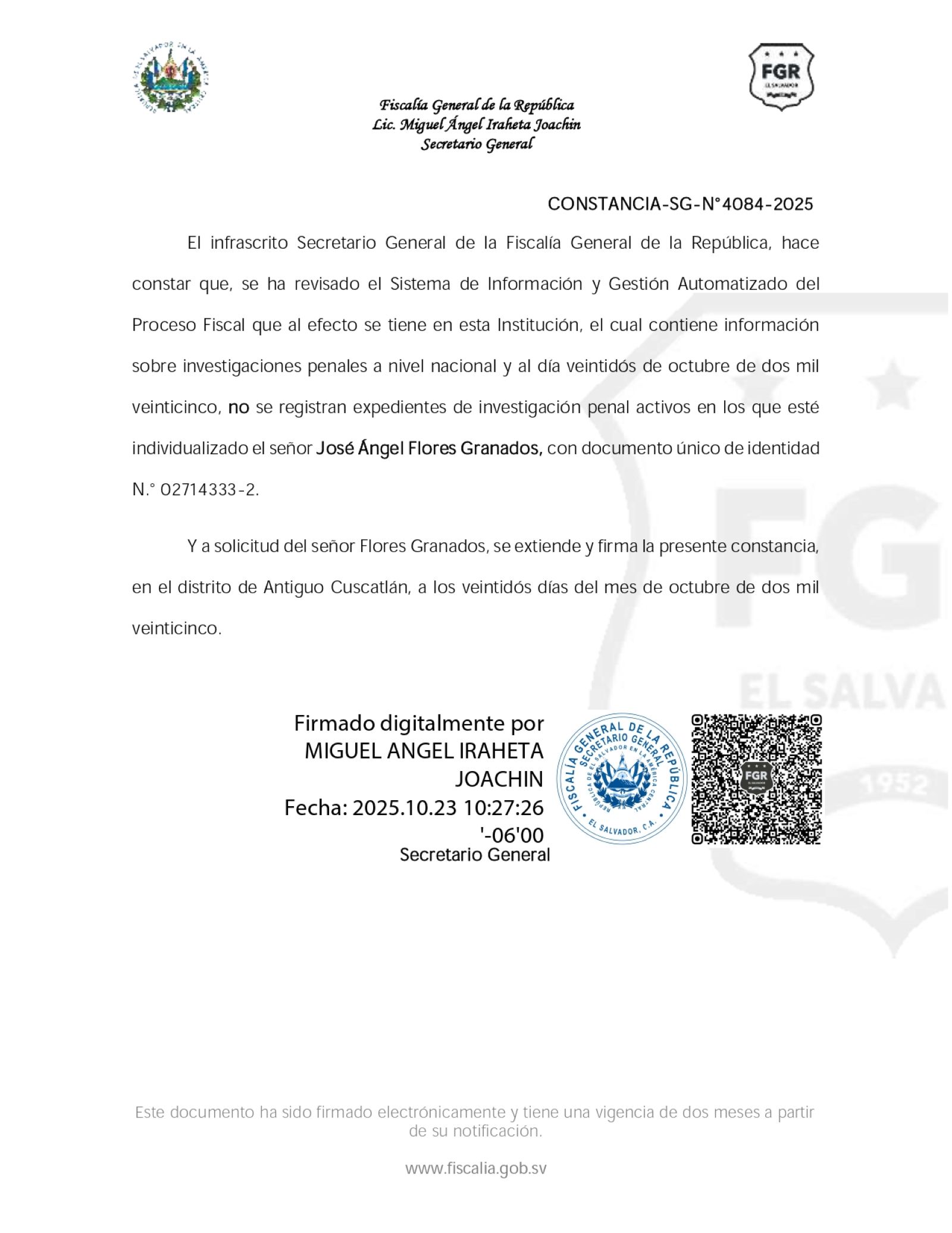 NOTIFICACIÓN. En una constancia emitida el 22 de octubre, la Fiscalía General de El Salvador informó que no existía ningún proceso penal contra el líder comunitario, José Flores. Fiscalía General de la República