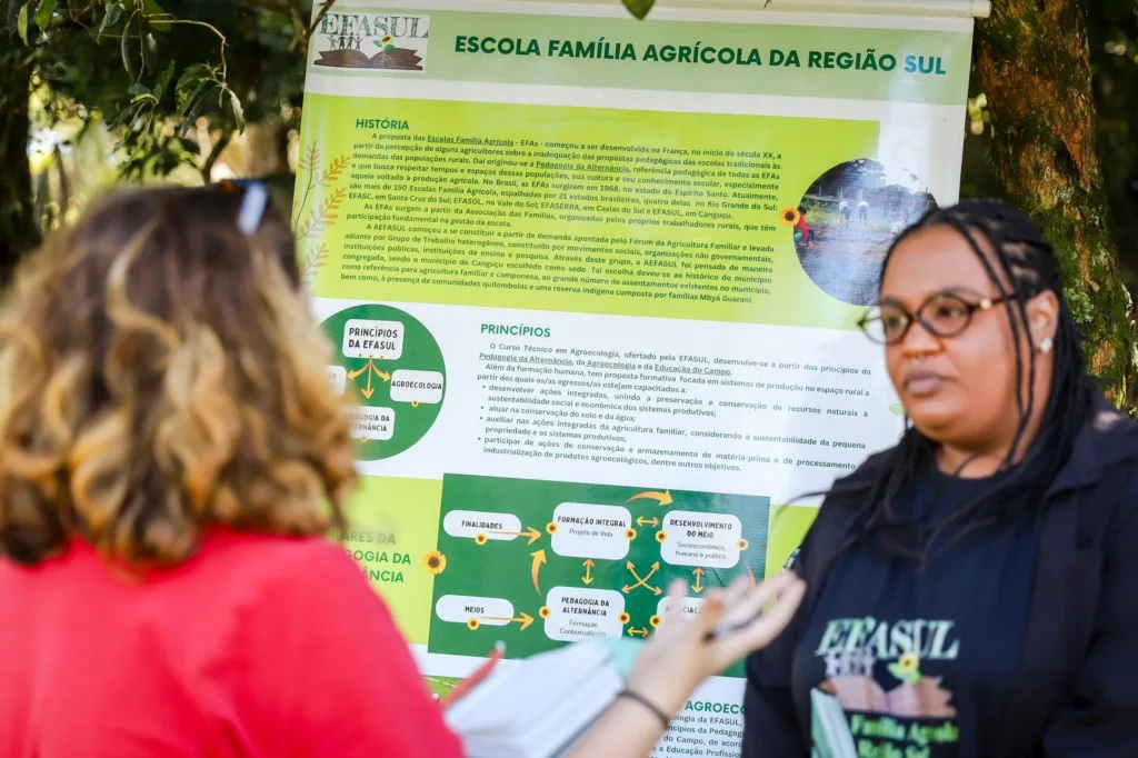 Segundo ela, a escola oferece ensino médio com formação técnica em agroecologia, atuando como contraponto ao modelo do agronegócio. “A gente surge como uma resistência, partindo da base, que é a juventude. A proposta é manter eles no campo, com conhecimento, respeitando a diversidade e a natureza.”