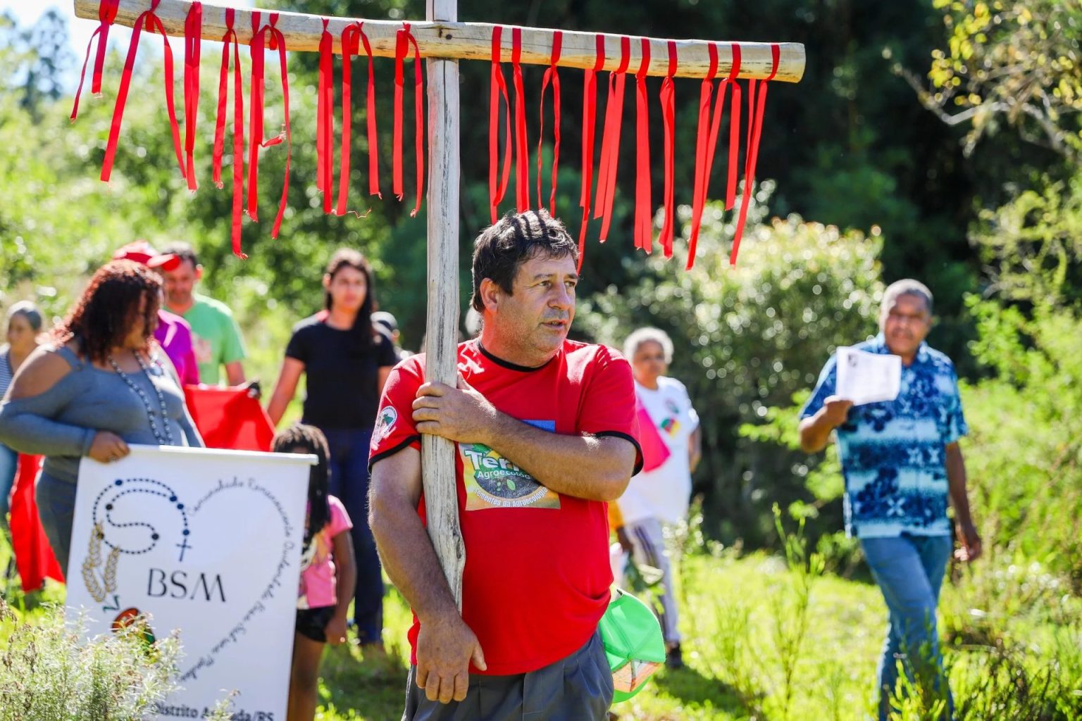 Ao longo da romaria, a defesa da agroecologia apareceu associada à crítica ao modelo dominante de produção agrícola e à denúncia da violência no campo. O extensionista da Emater, professor de geografia e quilombola de Canguçu, Leandro Rodrigues Flor, relacionou a luta pela terra com a permanência de conflitos, retomando o Massacre de Eldorado do Carajás como marco histórico.