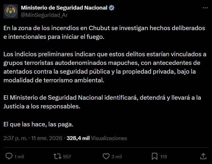 Desde el 9 de diciembre se quema el Parque Nacional Los Alerces. ¿Qué pasó? ¿Por qué lo dejaron quemar? ¿Por eso desalojaron en 2025 el Lof Pailako, porque tienen intereses en esa zona? Ya hay miles y miles de hectáreas de tierra arrasada, por decisión política. Apelamos a la conciencia social a que repudiemos estos dichos sin prueba, tal como lo mencionó el Fiscal Carlos Díaz Mayer en el programa “Mañana Silvestres”.