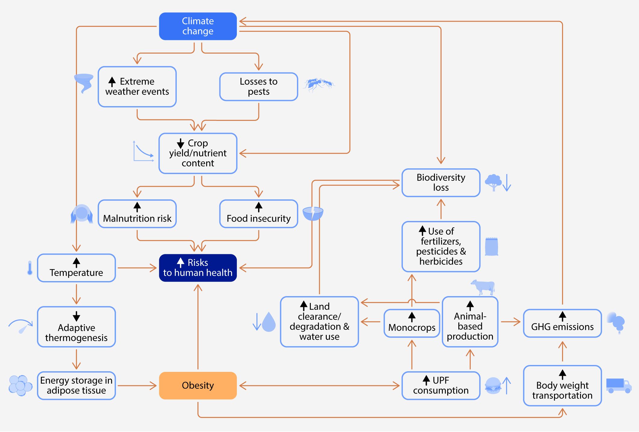 Os pesquisadores analisaram evidências mostrando que tanto a obesidade quanto os danos ambientais resultam de um sistema alimentar orientado pelo lucro, que incentiva alto consumo e prejudica a saúde. O ambiente alimentar atual promove produtos hipercalóricos e pobres em fibras, especialmente alimentos ultraprocessados, que favorecem o ganho de peso. Esses mesmos sistemas de produção, particularmente envolvendo produtos de origem animal, liberam grandes quantidades de gases de efeito estufa e exercem pressão sobre terra e água.