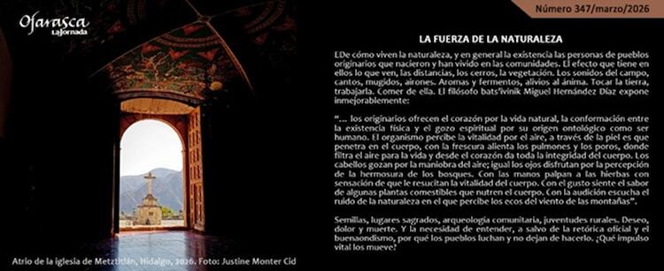 De cómo viven la naturaleza, y en general la existencia las personas de pueblos originarios que nacieron y han vivido en las comunidades. El efecto que tiene en ellos lo que ven, las distancias, los cerros, la vegetación. Los sonidos del campo, cantos, mugidos, airones. Aromas y fermentos, alivios al ánima. Tocar la tierra, trabajarla. Comer de ella. El filósofo bats’ivinik Miguel Hernández Díaz expone inmejorablemente:
