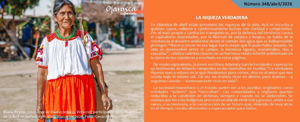 En Ojarasca de abril están presentes las riquezas de la vida. Acá se escucha a quienes suave, valiente y candorosamente luchan con claridad y compromiso. Por el maíz propio y contra los transgénicos, por la defensa del territorio contra el capitalismo depredador, por la libertad de palabra y lengua. Se habla de la resistencia al desastre ambiental desde el común. Del agua que es indispensable proteger.