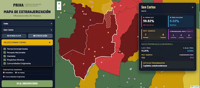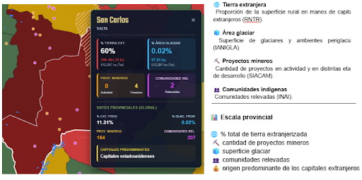 A modo de ejemplo, en el departamento de San Carlos (Salta), alrededor del 60% de la superficie rural se encuentra en manos extranjeras. En este territorio se localiza una zona con glaciares de escombros, fundamentales para la regulación de las cuencas hídricas de los valles intermontanos. Allí se registran además cuatro proyectos mineros previstos y la presencia de dos comunidades indígenas con el relevamiento culminado (y cuatro más cuyos trámites de relevamiento no fueron terminados al momento de derogación de la ley 26.160), configurando un espacio donde convergen intereses productivos, ambientales y comunitarios. Estos glaciares se ubican en el límite con el departamento de Cafayate, que presenta cerca del 23% de su superficie extranjerizada.
