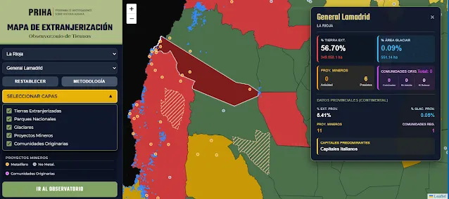 En General Lamadrid (La Rioja), la superposición de estas dinámicas también resulta significativa: alrededor del 57% de la superficie rural está en manos extranjeras y existen seis proyectos mineros previstos, varios vinculados a capitales de origen canadiense, localizados en zonas con presencia de ambientes glaciares o periglaciares.