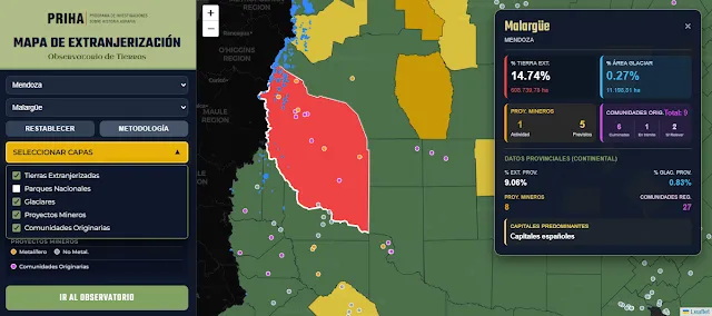 En el departamento de Malargüe (Mendoza) encontramos una situación similar, con más de 600 mil hectáreas en manos extranjeras. Allí opera una empresa minera extranjera y, al momento de la elaboración de los datos públicos, se preveían 5 proyectos más (de extracción de uranio, potasio, oro, cobre, hierro). El gobernador Cornejo ha reconocido públicamente que actualmente superan la decena. Este territorio también posee más de 11 mil hectáreas de área glaciar, sobre la cual se ubica, por ejemplo, el proyecto de extracción de cobre controlado por la firma Wincul S.A. donde habitan un tercio de las comunidades indígenas a nivel provincial, seis de las cuales con el relevamiento del Re.Na.Ci concluido. Gran parte de dichas comunidades también lindan con la explotación de uranio que realiza la empresa canadiense Blue Sky Uranium Corp.
