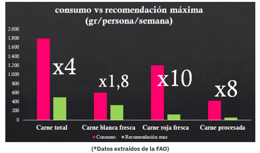 Los datos no dejan lugar a dudas: comemos no mucha, sino muchísima carne. Y, especialmente, comemos una barbaridad de la carne más insana: la roja y la procesada. Comemos seis veces más carne de la recomendación máxima, y eso es mucho; pero, además, comemos diez veces más carne roja de la recomendada y ocho veces más de la procesada. ¿Y qué hay de la población infantil española? Come entre 3,5 y 4 veces más carne que el máximo recomendado; 3,5 veces más carne roja y entre el doble y el triple de procesada.