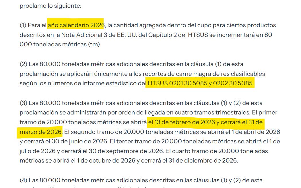 Luego del anuncio realizado por al Casa Blanca este viernes, entre los exportadores de carne hubo quienes desesperados comenzaron a indagar sobre las dos posiciones arancelarias mencionadas concretamente por Trump como parte de este cupo adicional. Es que una vez más no hubo comunicación formal del gobierno argentino (Adorni no va bien como vocero de la Casa Blanca) y todos nos debimos arreglar con los documentos emitidos allá lejos. “Las 80.000 toneladas métricas adicionales descritas en la cláusula 1 de esta proclamación se aplicarán únicamente a los recortes de carne magra de res clasificables según los números de informe estadístico del HTSUS 0201.30.5085 y 0202.30.5085”, decía el informe de la Casa Blanca sobre el cupo de carne adicional para 2026 acordado por fuera del pacto comercial.