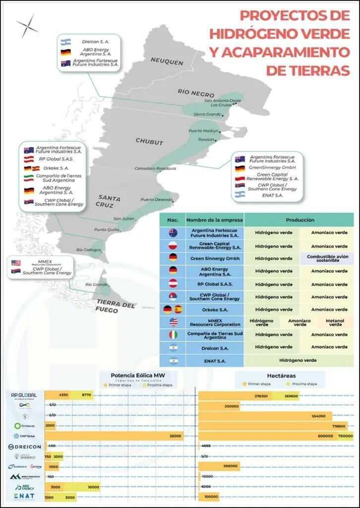 En septiembre la Legislatura de Chubut aprobó un pedido informes impulsado por el diputado Santiago Vasconcelos, para que el Ejecutivo dé precisiones sobre la adquisición de campos por parte de empresas como Argentina Fortescue Future Industries S. A., Green Capital Renewable Energy S. A., GreenSinnergy GMBH S.R.L., ABO Energy Argentina S. A., RP Global S. A. S., Southern Cone Energy, Orkeke S. A. y Nordex Energy Argentina S. A., que promocionan proyectos para la producción de hidrógeno verde y derivados en la Patagonia. El objetivo es conocer la ubicación y superficie de los establecimientos comprados o arrendados por esas empresas, los usos productivos de esos predios, y si las firmas tienen proyectos en etapa de evaluación del impacto ambiental.
