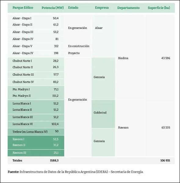 Según registros de la Secretaría de Energía de la Nación, en Chubut hay 170.000 h afectadas por centrales de generación eléctrica renovable no convencional y térmica, distribuidas en los departamentos Escalante, Florentino Ameghino, Rawson y Biedma. Esas superficies se compraron o arrendaron para instalar parques eólicos o centrales térmicas, lo que no significa que los predios están completamente ocupados por infraestructuras energéticas, ni tampoco, que haya sido abandonada la actividad ganadera. Alrededor de 100.000 de esas hectáreas corresponden a los campos donde, en los últimos 15 años, se construyeron las diferentes etapas de los parques Aluar, Chubut Norte, Loma Blanca, Puerto Madryn, Rawson y Trelew, ubicados en el noreste de la provincia.
