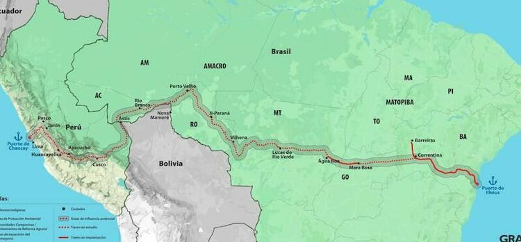 En Brasil, la propuesta busca articular el Ferrocarril de Integración Oeste–Este (FIOL) con el Ferrocarril de Integración Centro–Oeste (FICO) y construir un tramo adicional que partiría del mayor polo agroindustrial del continente, la ciudad de Lucas do Rio Verde, en Mato Grosso, adentrándose en el llamado Arco de la Deforestación, en los estados de Rondônia y Acre [17].