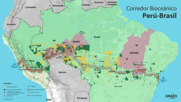 La nueva propuesta contempla una ruta de 3 000 km del ferrocarril bioceánico Brasil–Perú que conectaría el puerto de Ilhéus, en la costa atlántica brasileña, con el puerto de Chancay, en el Pacífico. Del lado peruano, la ruta difundida atravesaría siete departamentos, entre ellos Madre de Dios, a través de la Pampa —una zona de producción aurífera donde la minería ha arrasado extensas áreas de bosque tropical—, explica el geógrafo de CooperAcción Mauricio Pinzás. Sin embargo, el Estado peruano sigue considerando cuatro corredores viales alternativos que pasarían por Pucallpa, lo que podría afectar a numerosos territorios indígenas y áreas de conservación.