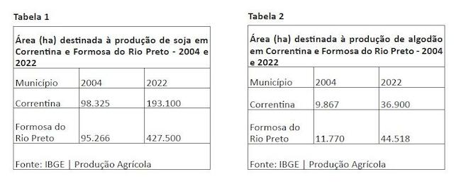 A área de monocultivo de soja e a rápida expansão do cultivo algodoeiro nos municípios de Formosa do Rio Preto e Correntina estão refletidas nos dados de área ocupada, nas tabelas abaixo: