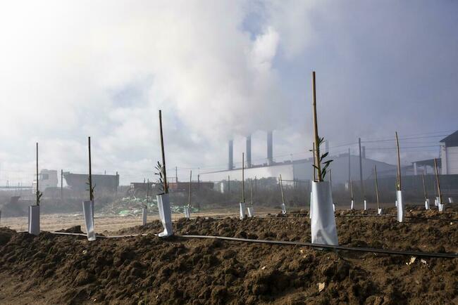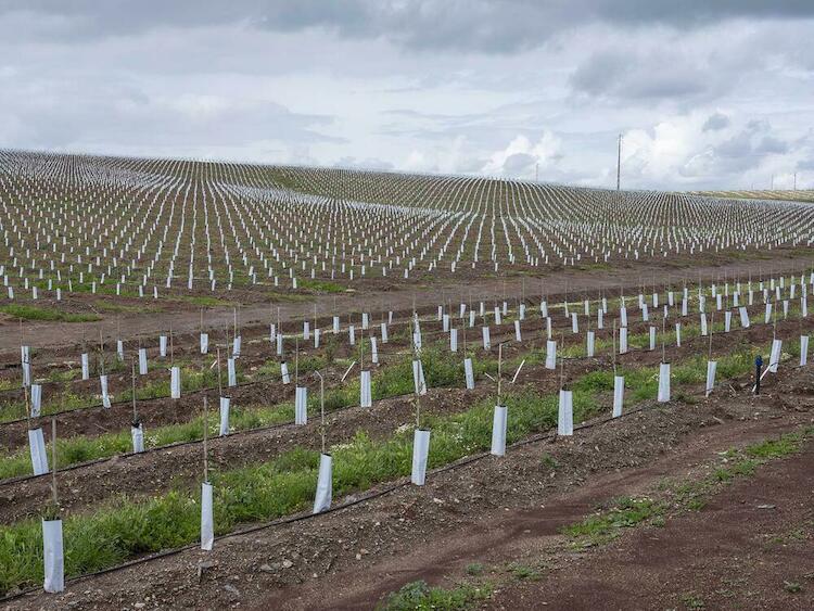 Las hileras de olivos recién plantados se extienden hasta el horizonte. Envueltas en plástico blanco, las interminables filas de plantones semejan tumbas en un paisaje convertido en un cementerio de biodiversidad. En un muro de Nossa Senhora das Neves, un pueblo cerca de la ciudad de Beja, puede leerse “Olivar aquí = ††† (muerte)” como protesta contra una plantación intensiva de olivos establecida a pocos metros de las casas. En todo el Alentejo, en el sur de Portugal, grandes olivos antes cultivados de forma tradicional se apilan junto a las carreteras, arrancados para dar paso a plantaciones industriales en seto de gran densidad.