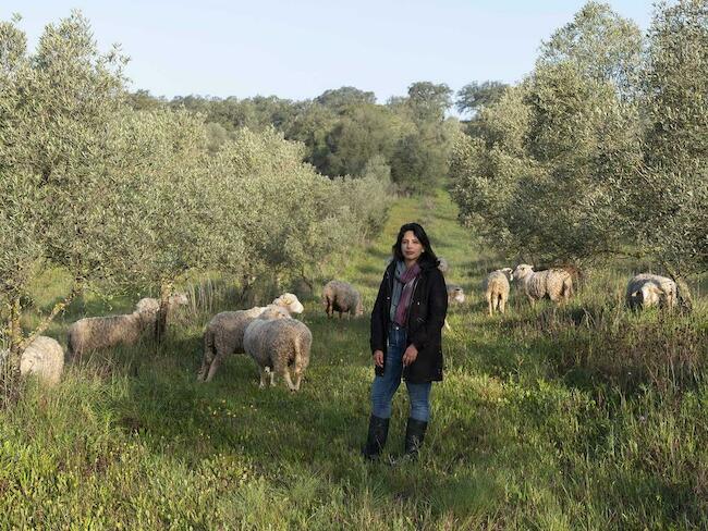 Eva Barrocas con sus ovejas en el olivar. Foto: André Paxiuta