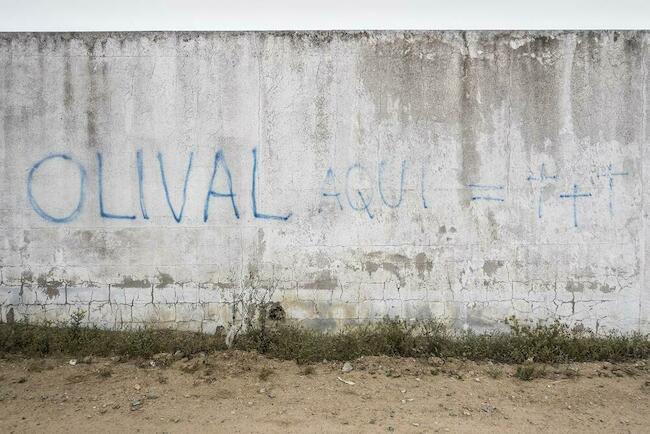 Pintada en al que se puede leer "Olivar aquí = ††† (muerte)". Foto: André Paxiuta