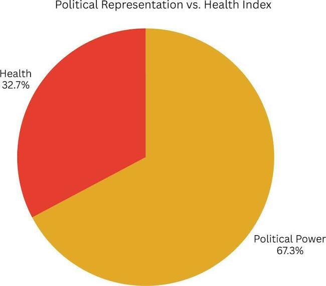 Representación política versus índice de salud – Salud: 32.7%, Poder político: 67.3%. Gráfico del autor, utilizado con autorización.