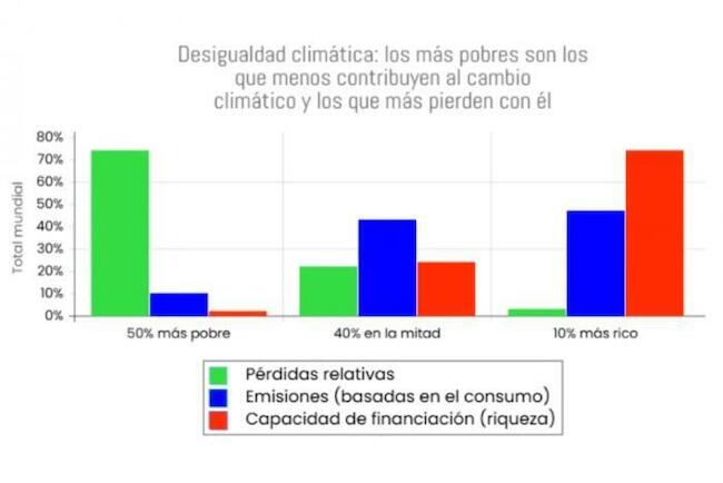 La desigualdad, además de ser creciente, se extiende de manera uniforme. Los daños provocados por el cambio climático en las economías individuales y de las familias continuarán afectando de forma desproporcionada a los más pobres del planeta. Según el informe, la mitad más pobre de la población mundial soportará la mayor parte de las pérdidas de ingresos derivadas de sequías, inundaciones, olas de calor y otros fenómenos extremos, mientras que las élites del norte global, responsables de la mayoría de las emisiones a través de la propiedad del capital, sufrirán impactos comparativamente menores.