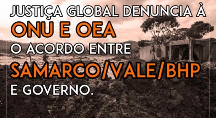 A Justiça Global enviará nos próximos dias uma denúncia à Organização das Nações Unidas (ONU) e à Organização dos Estados Americanos (OEA), em que relata a iminente ameaça a direitos humanos decorrente de um acordo a ser firmado entre as mineradoras Samarco, Vale e BHP e o poder público federal e estadual. O acordo encerra a ação civil pública que está sendo movida contra as empresas pelas violações humanas, sociais e ambientais decorrentes do rompimento da barragem de rejeitos do Fundão, em Mariana, no dia 5 de novembro de 2015.