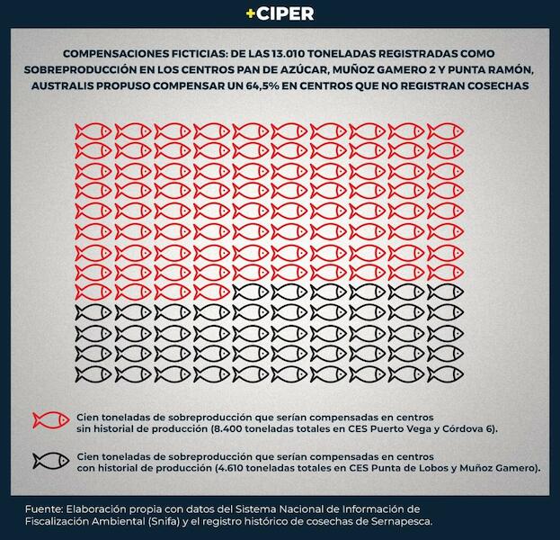 Por ejemplo, los centros Pan de Azúcar, Muñoz Gamero 2 y Punta Ramón, presentaron una sobreproducción total de 13.010 toneladas, según la autodenuncia. El plan de cumplimiento de Australis proponía repartir la compensación en cuatro centros: Punta de Lobos, Muñoz Gamero, Puerto Vega y Córdova 6. En ese momento, ni Puerto Vega ni Córdova 6 registraban cosechas, en circunstancias que se pretendían compensar en ellos 4.320 y 4.080 toneladas, respectivamente, equivalentes a un 64,5% de la sobreproducción registrada en los centros infractores.