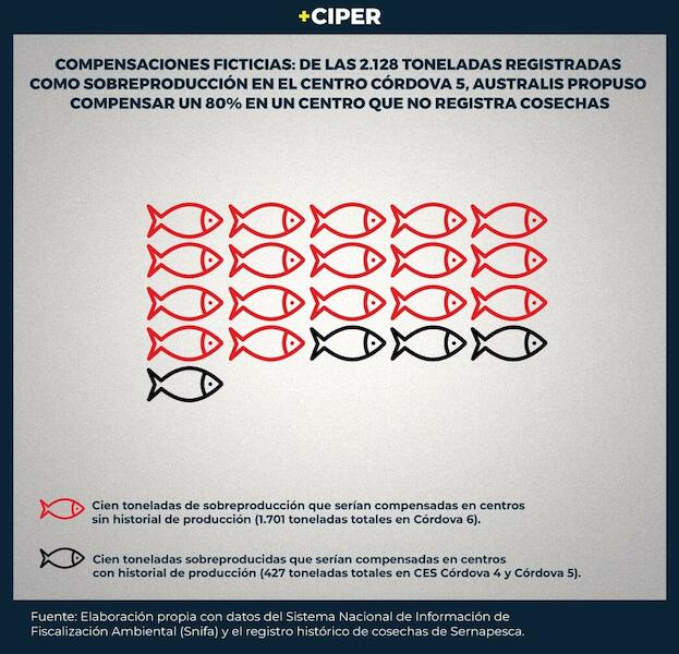 En 2022, Australis se autodenunció por sobreproducción de 81 mil toneladas de salmónidos. CIPER tuvo acceso a un correo interno de la empresa donde se asegura que, antes de la autodenuncia, el entonces superintendente de Medio Ambiente subrogante, Emanuel Ibarra, llegó a un acuerdo con la salmonera: que compensara la sobreproducción bajando el tonelaje en centros de cultivo que, aunque contaban con permisos para funcionar, no registraban historial de producción.