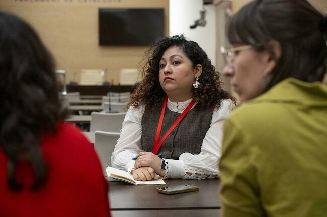 Angelica Cárcamo, una de las periodistas salvadoreñas en el exilio en su reciente visita a Barcelona. Cárcamo es fundadora y CEO de Infodemia.com, el primer portal especializado en verificación de noticias en El Salvador y directora de la Red Centroamericana de Periodistas (RCP). Es también expresidenta de la Asociación de Periodistas de El Salvador (APES). Ha trabajado para medios comunitarios como la Red ARPAS y ALER. También ha sido colaboradora de Reuters.