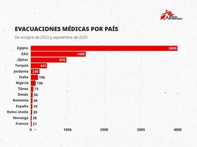 Según datos de la Organización Mundial de la Salud (OMS), a octubre de 2025, más de 15.600 personas —1 de cada 4, niños y niñas— están a la espera de una evacuación médica que les salve la vida desde Gaza. Entre los pacientes hay personas con lesiones traumáticas complejas causadas por balas y bombardeos, así como con enfermedades crónicas o potencialmente mortales, como cáncer o insuficiencia renal.