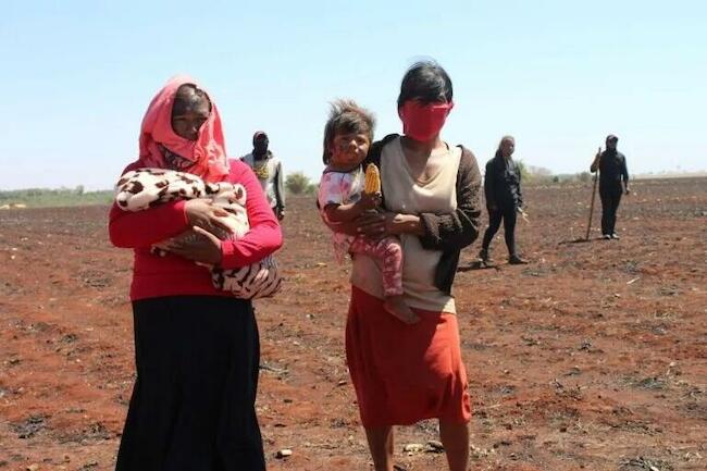 Hay un número significativo de mujeres, niños y jóvenes en el espacio de la retomada. La aridez del tiempo seco y cálido en los vestigios de la tierra que hace pocos días era un monocultivo de maíz compone el paisaje formado por madres con bebés, niños sentados en la tierra y adultos aprensivos con la situación, empuñando arcos, flechas y machetes. Una mamá Kaiowá, con el rostro tapado con una camiseta, para no ser identificada, denuncia la realidad vivida por su hija, que necesita recurrentemente atención de salud en función de la contaminación por agrotóxicos aplicados por los hacendados contra Guyraroká. Ella cuenta que la nena posee un extenso prontuario en los servicios de salud debido a las ocurrencias ocasionadas por las intoxicaciones. Afirma encontrar dificultades de atención por parte de los agentes de salud por pertenecer a la retomada. El sufrimiento vivido por su hija y la comunidad es lo que movilizó a esta mamá a sumarse a la acción de recuperación de tierra.