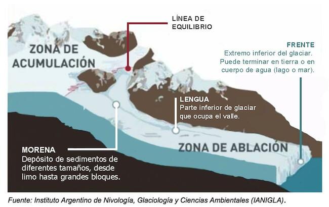 Un glaciar es básicamente una gran masa de hielo y nieve que se mantiene a lo largo del tiempo. Brinda una belleza paisajística enorme, son imponentes al observarlos o caminar en ellos y en nuestra cordillera están presentes en todas las provincias. Cualquiera que los haya visto o pudo caminar sobre ellos entiende la importancia de su protección. Se forman porque, durante el invierno, la nieve se acumula, se compacta y se transforma en hielo, y esa masa no llega a derretirse del todo cuando llega el verano. Luego de un tiempo, el hielo alcanza cierto grosor y la fuerza de la gravedad hace que empiece a deslizarse cuesta abajo. Por eso, dentro de un glaciar hay distintas zonas: en la parte de arriba, donde hace más frío, se suma más nieve y el glaciar crece; esa es la zona de acumulación. Más abajo, en cambio, está la zona de ablación, donde el hielo y la nieve se derriten o se evaporan y el glaciar pierde masa. Como los glaciares dependen tanto de la cantidad de nieve que cae como de la temperatura, sus comportamientos brindan indicadores para saber y entender los procesos ligados al cambio climático. Este es el ambiente que supuestamente Cacciola dice que “todos estamos de acuerdo en proteger”.