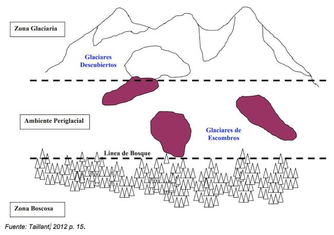 Ahora bien, para entender el problema comprendamos qué es un ambiente periglaciar. Este se encuentra cercano a los ambientes glaciarios, pueden estar rodeándolos pero también pueden no estar asociados, es decir, el ambiente periglacial puede no estar dentro del entorno de un glaciar. En una investigación sobre este ambiente, se lo define como “una zona donde, por la baja temperatura del ambiente, generalmente cercano a los 0˚ centígrados o menos, la tierra, está congelada. Este congelamiento puede ocurrir en la superficie, por encima de la superficie, y/o por debajo de la superficie. Es importante el ambiente periglacial porque si hay humedad en la tierra, esa humedad se congela (se hace hielo). Y si hay hielo en el ambiente periglacial, se convierte en una reserva hídrica, ya que si se llega a descongelar de manera temporaria o de manera definitiva, ese hielo se convierte en agua. Pueden existir zonas en el ambiente periglacial donde el ambiente está congelado pero no hay humedad con lo cual no habría hielo y no sería por ende, una reserva hídrica. Puede haber zonas en el ambiente periglacial que permanecen congeladas todo el tiempo, y otras que se congelan y se descongelan cíclicamente” (Taillant,2012:14) [ 3].