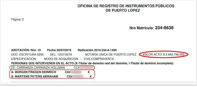 En otras ocasiones, y al igual que Aliar-Fazenda, los menonitas han adquirido tierras de herederos de Víctor Carranza. Hollman Carranza Carranza, hijo del temido paramilitar, vendió por casi 3 mil millones de pesos tierras a Bergen Friesen Heinrich, y a Martens Peter Abraham.