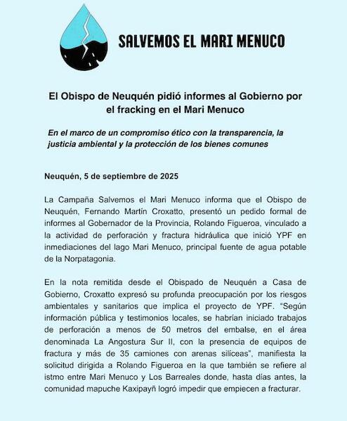 Los riesgos no son hipotéticos: un solo derrame o filtración podría liberar compuestos químicos altamente tóxicos, comprometiendo la salud, la producción frutícola del Alto Valle y los ecosistemas que sostienen la vida. Por eso, la campaña convocó a una conferencia de prensa en la Casa de Gobierno y a una caravana al Mari Menuco, realizada el pasado 6 de septiembre, de la que participaron más de 80 vehículos para visibilizar el conflicto y exigir el cese inmediato de la actividad. Para esa fecha, el reclamo sumó una dimensión inédita. El Obispo de Neuquén, Fernando Martín Croxatto, envió una carta formal al gobernador Figueroa exigiendo información pública sobre los pozos iniciados por YPF junto al embalse.