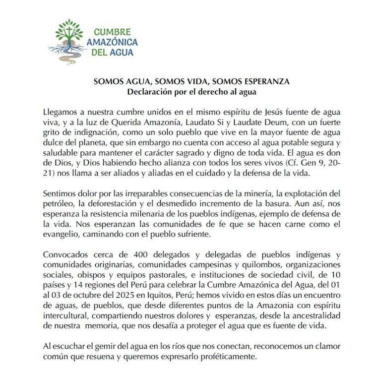 Durante tres días, alrededor de 400 representantes de pueblos indígenas, comunidades campesinas, obispos, equipos pastorales e instituciones de sociedad civil de diez países y 14 regiones del Perú se reunieron en la ciudad de Iquitos (Loreto) para participar en la Cumbre Amazónica del Agua, con el fin de compartir experiencias y preocupaciones en torno al cuidado y acceso al agua.
