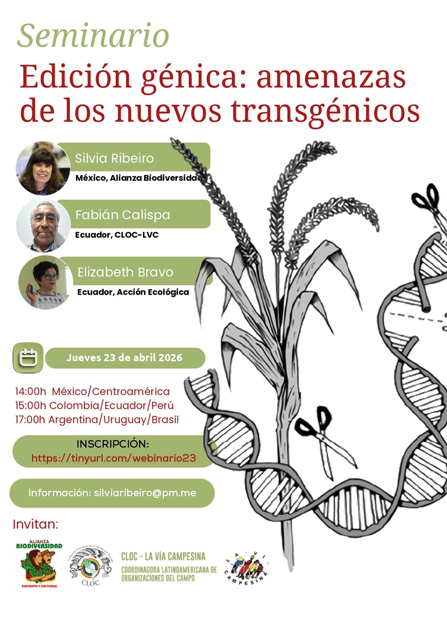 "Desde la Alianza Biodiversidad y la CLOC-LVC les invitamos a participar de un seminario en línea el 23 de abril, de capacitación sobre las tecnologías y sus impactos, seguido de discusión de estrategias ante estas nuevas tecnologías".