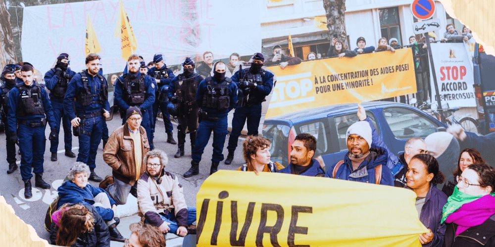 El 14 de enero de 2026, una delegación campesina de la Confédération Paysanne en Francia, ocupó la sede del Ministerio de Agricultura en París para exigir la descolonización de la agricultura francesa y denunciar el abandono de las autoridades a la agricultura de pequeña escala. A pesar de que la protesta era pacífica, 52 campesinxs fueron detenidos a la fuerza, acción donde también intervino la BRavM (Brigada de Represión de la Acción Violenta Motorizada), una unidad policial especializada. Entre lxs detenidxs se encontraba una nutrida delegación de campesinxs de los DROMs (departamentos y regiones francesas situadas fuera del territorio continental, entre las que se incluyen Guadalupe, Martinica, Reunión, Mayotte y la Guayana Francesa). Según el campesinado francés, este nivel de criminalización nunca antes se había visto en el país, por una acción cuya radicalidad no era elevada.